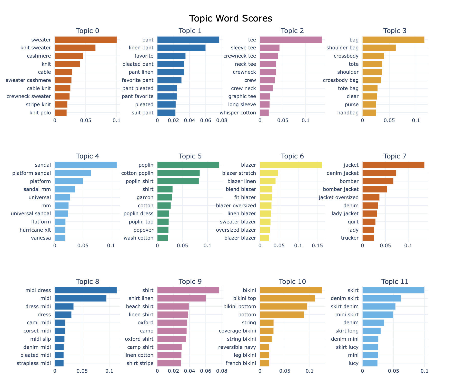 Above are a BERTopic visualization that is prebuilt in the library easily visualizes bar charts of your categorized data.